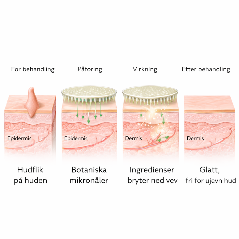 For beste resultater bør hudlappene sitte på 6–8 timer, slik at mikronålene kan virke og hudknoppen behandles effektivt.